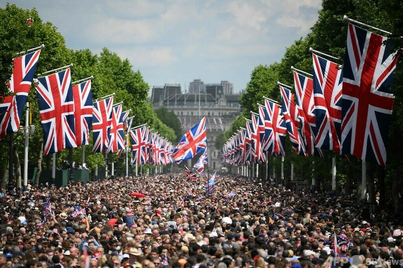 一方、王室を離脱し現在は米カリフォルニア州で暮らす女王の孫ヘンリー王子(Prince Harry)と妻メーガン妃(Meghan, Duchess of Sussex)は珍しく訪英し、同日の行事に出席。バッキンガム宮殿(Buckingham Palace)から少し離れた建物で、目立たない位置からパレードを観賞した。3日の礼拝には参加するとみられている。(c)AFP