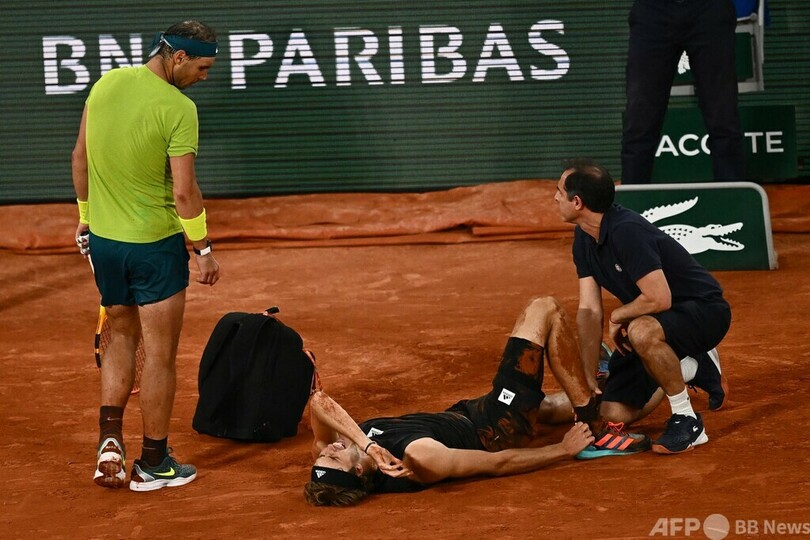 試合時間が3時間を超える中、25歳のズベレフはチームと家族が座っていたプレーヤーズボックスの前で打球を追い掛けると、足をひねって転倒。約1万5000席のコート・フィリップ・シャトリエ(Court Philippe-Chatrier)に響き渡るほどの叫び声を上げ、泣きながら医療スタッフの手を借りて車いすでコートを後にした。そして数分後、松葉づえをつきながら戻ってくると、棄権を申し出た。