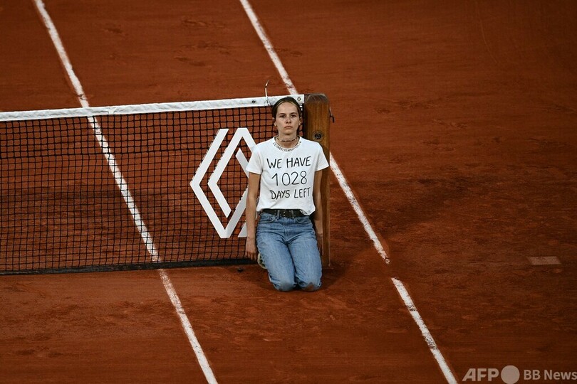 環境活動家がネットに体くくりつける、全仏OP男子準決勝が中断
