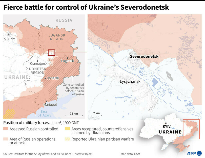 【6月7日 AFP】(写真追加)ロシアのセルゲイ・ショイグ(Sergei Shoigu)国防相は7日、ロシア軍がウクライナ東部の要衝セベロドネツク(Severodonetsk)の住宅地を完全に掌握したと発表した。