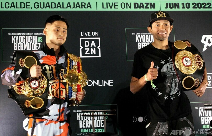 【6月9日 AFP】10日に行われるボクシング、WBA世界ライトフライ級王座統一戦に向けた記者会見が8日、メキシコ・グアダラハラ(Guadalajara)で行われ、スーパー王者の京口紘人(Hiroto Kyoguchi)と正規王者エステバン・ベルムデス(Esteban Bermudez、メキシコ)が出席した。(c)AFP