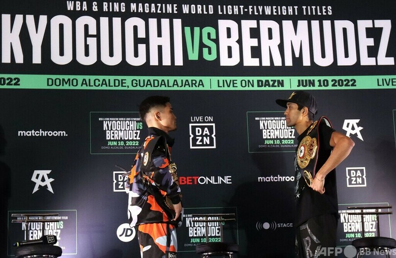 【6月9日 AFP】10日に行われるボクシング、WBA世界ライトフライ級王座統一戦に向けた記者会見が8日、メキシコ・グアダラハラ(Guadalajara)で行われ、スーパー王者の京口紘人(Hiroto Kyoguchi)と正規王者エステバン・ベルムデス(Esteban Bermudez、メキシコ)が出席した。(c)AFP