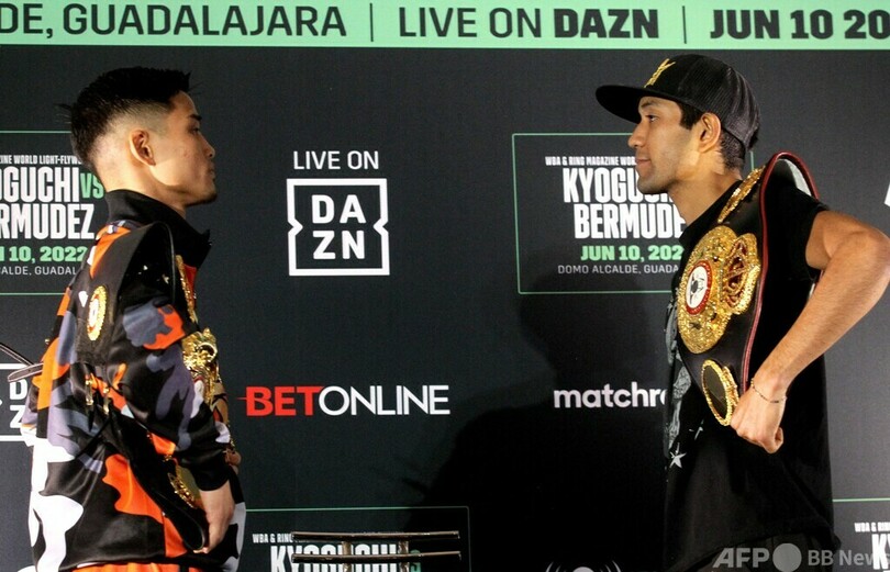 【6月9日 AFP】10日に行われるボクシング、WBA世界ライトフライ級王座統一戦に向けた記者会見が8日、メキシコ・グアダラハラ(Guadalajara)で行われ、スーパー王者の京口紘人(Hiroto Kyoguchi)と正規王者エステバン・ベルムデス(Esteban Bermudez、メキシコ)が出席した。(c)AFP