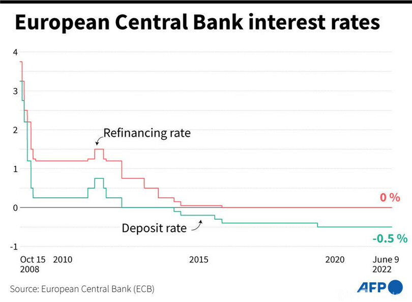 【6月10日 AFP】欧州中央銀行(ECB)は9日、7月から国債買い入れによる量的緩和策を終了し、加速するインフレを抑制するため一連の利上げを行うことを決めた。利上げは11年ぶりで、ユーロ圏の低金利時代に幕が下りることになる。