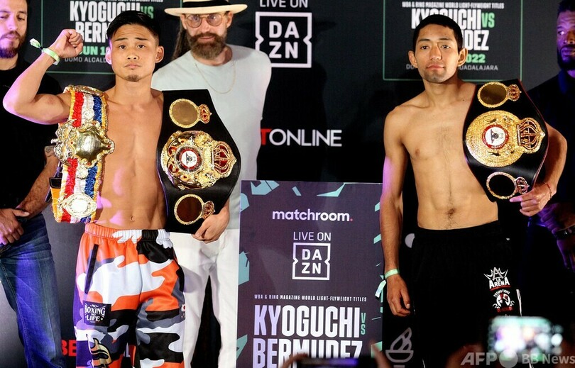 【6月10日 AFP】10日にボクシングのWBA世界ライトフライ級王座統一戦で対戦するスーパー王者の京口紘人(Hiroto Kyoguchi)と正規王者のエステバン・ベルムデス(Esteban Bermudez、メキシコ)が9日、メキシコ・グアダラハラ(Guadalajara)で前日計量に臨んだ。(c)AFP