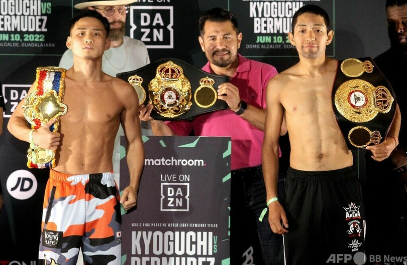 【6月10日 AFP】10日にボクシングのWBA世界ライトフライ級王座統一戦で対戦するスーパー王者の京口紘人(Hiroto Kyoguchi)と正規王者のエステバン・ベルムデス(Esteban Bermudez、メキシコ)が9日、メキシコ・グアダラハラ(Guadalajara)で前日計量に臨んだ。(c)AFP