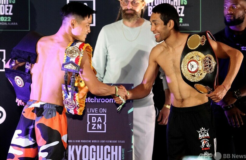 【6月10日 AFP】10日にボクシングのWBA世界ライトフライ級王座統一戦で対戦するスーパー王者の京口紘人(Hiroto Kyoguchi)と正規王者のエステバン・ベルムデス(Esteban Bermudez、メキシコ)が9日、メキシコ・グアダラハラ(Guadalajara)で前日計量に臨んだ。(c)AFP