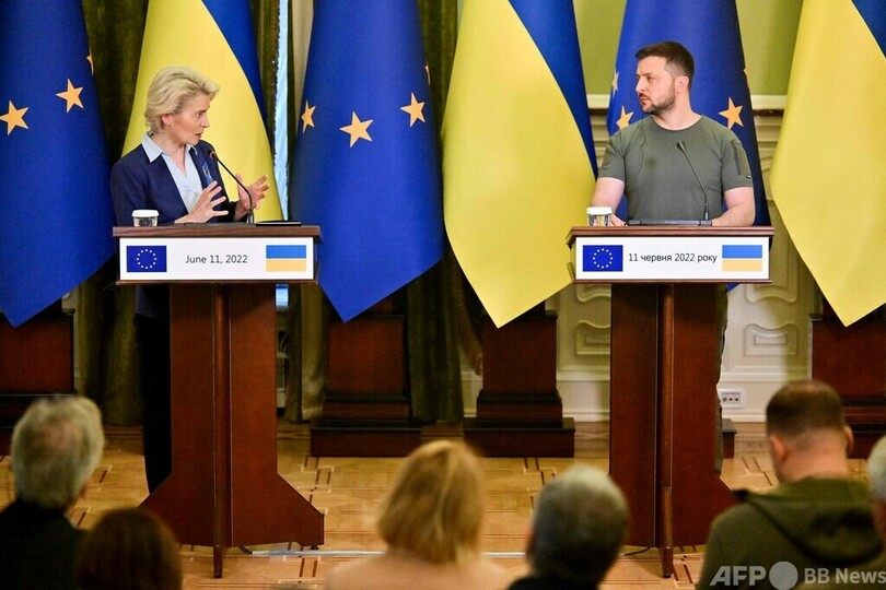 【6月12日 AFP】欧州連合(EU)欧州委員会(European Commission)のウルズラ・フォンデアライエン(Ursula von der Leyen)委員長は11日、ウクライナの首都キーウを訪問し、同国のEU加盟申請について来週中に意見書をまとめる方針を表明した。