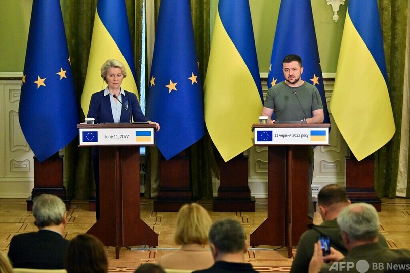 【6月12日 AFP】欧州連合(EU)欧州委員会(European Commission)のウルズラ・フォンデアライエン(Ursula von der Leyen)委員長は11日、ウクライナの首都キーウを訪問し、同国のEU加盟申請について来週中に意見書をまとめる方針を表明した。