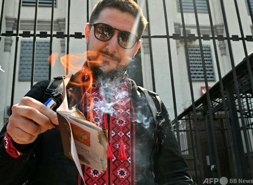 ロシア人男性、旅券燃やし侵攻に抗議 キーウの大使館前