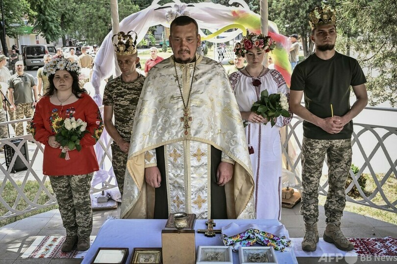 【6月13日 AFP】ロシア軍との戦闘が続くウクライナ東部ドンバス(Donbas)地方の前線から40キロほど離れたドルジュキウカ(Druzhkivka)で12日、ウクライナ兵同士のカップル2組が結婚した。