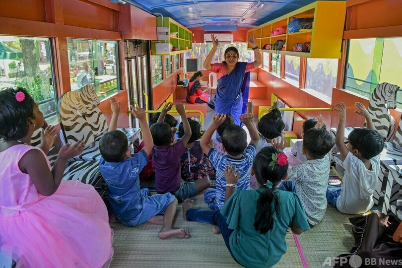 【6月18日 AFP】インド南西部ケララ(Kerala)州の州都ティルバナンタプラム(Thiruvananthapuram)で、教室になったバスの車内で子どもたちが遊び、学んでいる。