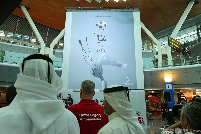 【6月16日 AFP】11月に開幕するサッカーW杯カタール大会(2022 World Cup)の公式ポスターが15日に公開され、ドーハのハマド国際空港(Hamad International Airport)でセレモニーが行われた。