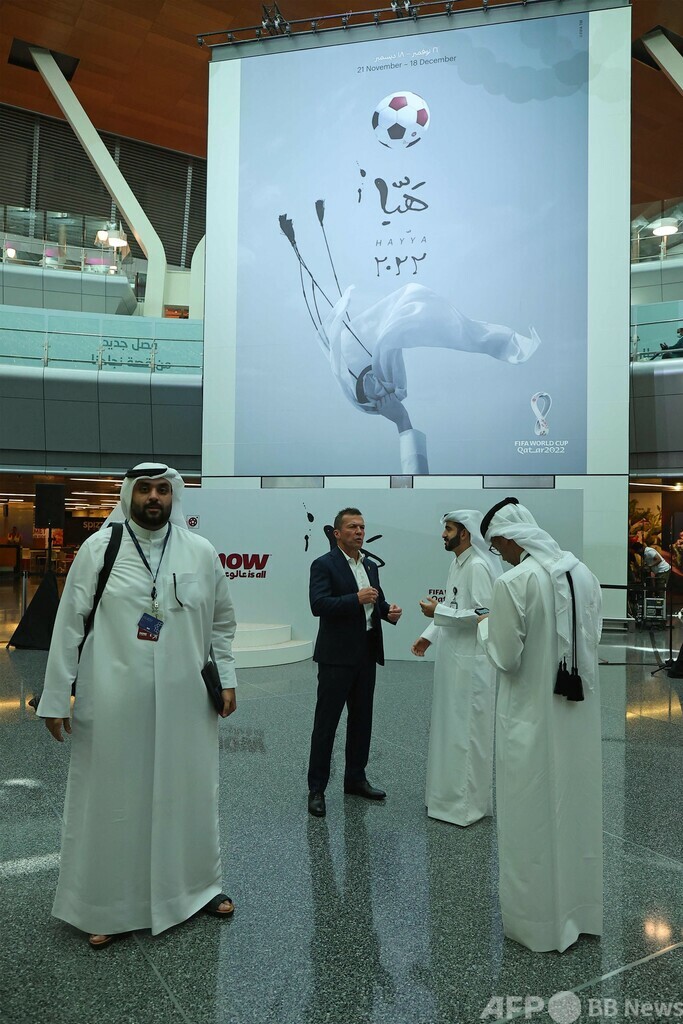 【6月16日 AFP】11月に開幕するサッカーW杯カタール大会(2022 World Cup)の公式ポスターが15日に公開され、ドーハのハマド国際空港(Hamad International Airport)でセレモニーが行われた。