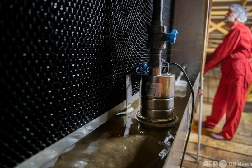 【6月20日 AFP】フランス西部トレメバン(Tremeven)で養豚業を営むセバスチャン・ブリズアール(Sebastien Brishoual)さんの豚舎。建物上部に水がしたたり落ちるパネルが設置されており、屋外から入ってきた空気はこのパネルを通って冷却され、各部屋に流れていく。(c)AFP