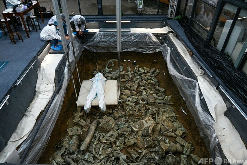 今回の発掘作業では、祭祀(さいし)エリア8号坑から出土した青銅器の破片だけでも5000片を超えており、研究者はコンピュータービジョンの技術を使ってこれらの破片を完全な青銅器に復元しています。コンピュータービジョン技術は破片の断面の模様や色などを比較することで、5000以上の小さな破片を数十の大きな断片に接合し、文化財復元の効率を大幅に向上させています。(c)CGTN Japanese/AFPBB News