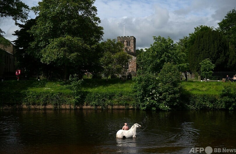 【6月22日 AFP】英イングランド北西部アップルビーインウェストモーランド(Appleby-in-Westmorland)で開かれた毎年恒例の馬の見本市「アップルビー・ホース・フェア(Appleby Horse Fair)」で、馬を川で水洗いする男性。開催期間中、馬の売買のために英国中から何千もの人々が集まる。(c)AFP