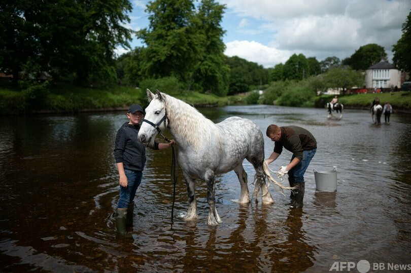 【6月22日 AFP】英イングランド北西部アップルビーインウェストモーランド(Appleby-in-Westmorland)で開かれた毎年恒例の馬の見本市「アップルビー・ホース・フェア(Appleby Horse Fair)」で、馬を川で水洗いする男性。開催期間中、馬の売買のために英国中から何千もの人々が集まる。(c)AFP