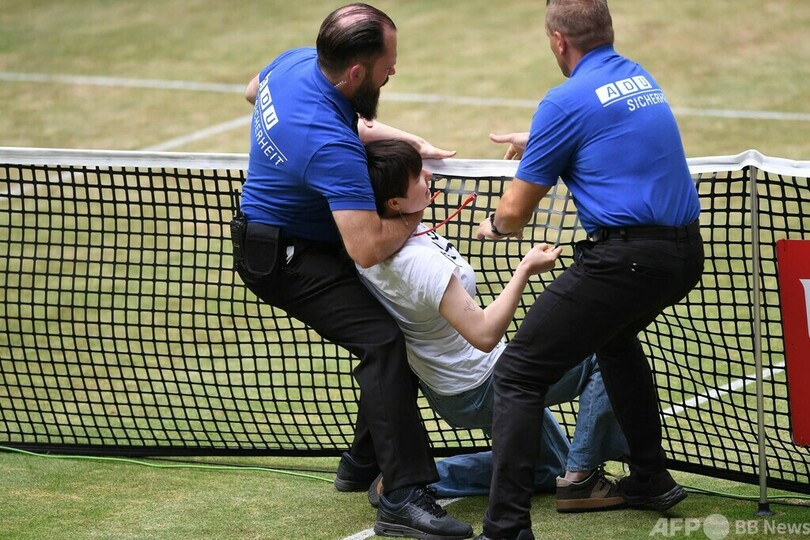 【6月20日 AFP】19日に独ハレ(Halle)で行われた男子テニス、テラ・ウォルトマン・オープン(2022 Terra Wortmann Open)のシングルス決勝で、女がコートに侵入して抗議を試み、試合が一時中断する場面があった。