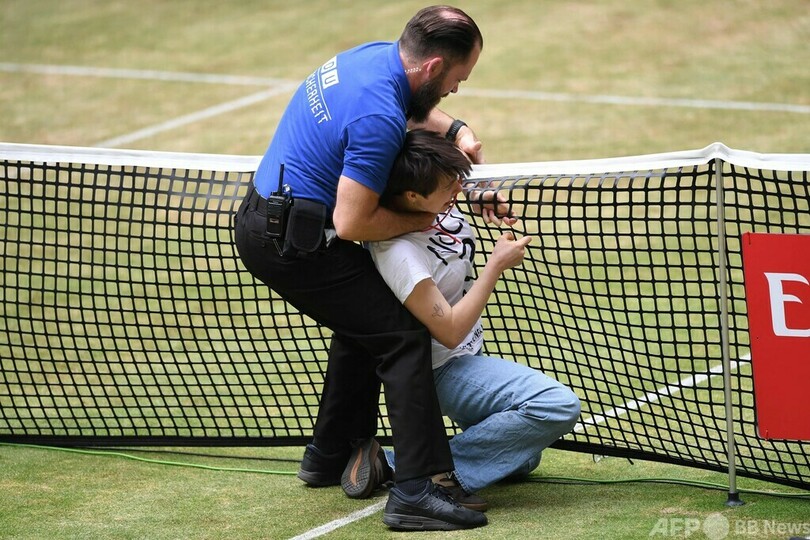 【6月20日 AFP】19日に独ハレ(Halle)で行われた男子テニス、テラ・ウォルトマン・オープン(2022 Terra Wortmann Open)のシングルス決勝で、女がコートに侵入して抗議を試み、試合が一時中断する場面があった。