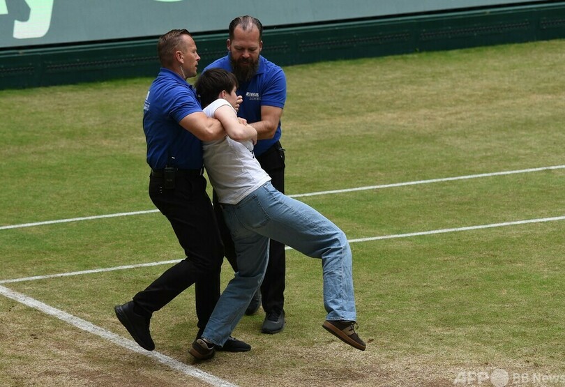 【6月20日 AFP】19日に独ハレ(Halle)で行われた男子テニス、テラ・ウォルトマン・オープン(2022 Terra Wortmann Open)のシングルス決勝で、女がコートに侵入して抗議を試み、試合が一時中断する場面があった。