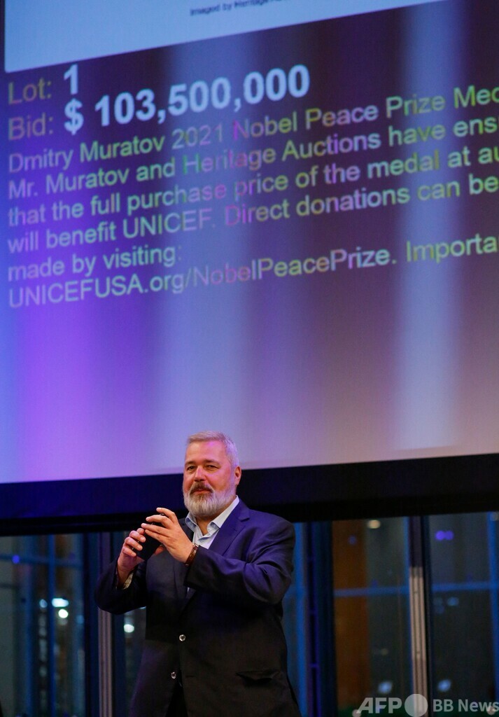 【6月21日 AFP】ロシア独立系紙ノーバヤ・ガゼータ(Novaya Gazeta)のドミトリー・ムラトフ(Dmitry Muratov)編集長が昨年受賞したノーベル平和賞(Nobel Peace Prize)のメダルが20日、競売にかけられ、1億350万ドル(約140億円)で落札された。