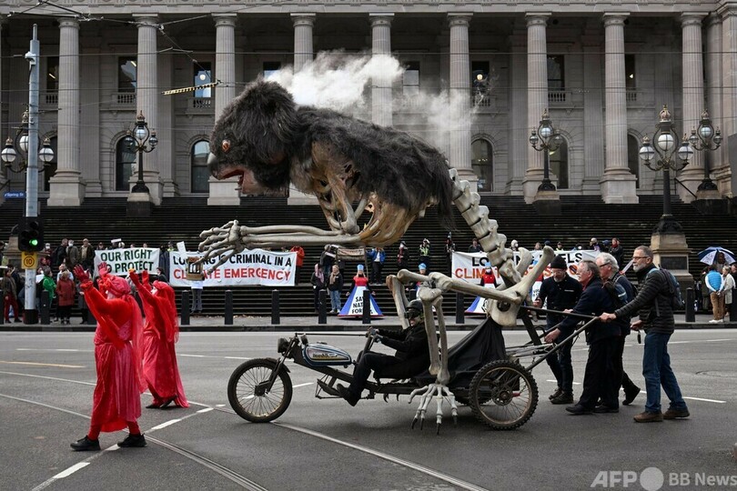 ニュース 社会 豪メルボルンで環境デモ 不気味なコアラが再登場 2022年6月21日 17:40 発信地:メルボルン/オーストラリア [ オーストラリア アジア・オセアニア ] このニュースをシェア ‹ › ❮ 2/8 ❯ オーストラリア・ビクトリア州メルボルンで、州議会議事堂前で行われた環境保護団体による抗議デモに登場した、やけどを負ったコアラを模した山車「ブリンキー」(2022年6月21日撮影)。(c)William WEST / AFP 画像作成中 ! 【6月21日 AFP】オーストラリア・ビクトリア(Victoria)州メルボルンで21日、環境保護団体が州議会議事堂の前で抗議デモを行った。やけどを負い、一部骨が見えるコアラを表現した山車「ブリンキー(Blinky)」も再登場した。 環境保護団体は、市民が森林伐採に抗議する目的で伐採地に足を踏み入れた場合に厳罰を科す州法案について、反対するよう議員らに呼び掛けた。(c)AFP 社会 一覧へ> メディア・報道関係・法人の方向け 写真・動画 購入のお問合せ>