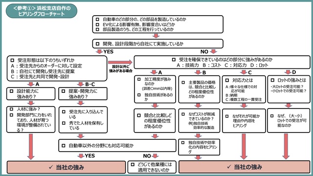 「もちろん、いきなりお客さまに対して『御社の強みは何ですか?』といった聞き方をしてしまうと、お客さまはびっくりされてしまいますよね。ですので、浜松支店が独自に作成したヒアリングのためのフローチャートを用いて、できるだけ細かくお話をお聞きしていくように努めています」