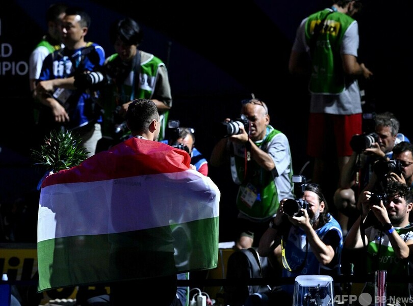 地元ハンガリーのクリストフ・ミラーク(Kristof Milak)が1分50秒34の世界新記録で優勝を果たし、フランスのレオン・マルシャン(Leon Marchand)が1分53秒37で2位に入った。(c)AFP
