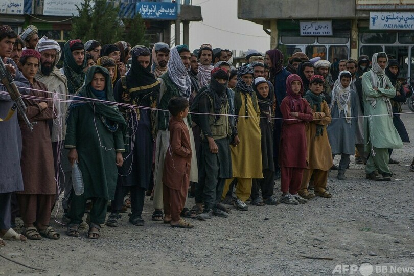 病院前には地元の男性100人ほどが行列をつくっていた。タリバン戦闘員によると、献血のためだという。「けさからもう約300人が献血した」と戦闘員は語った。(c)AFP/Emmanuel PEUCHOT and Abdullah HASRAT