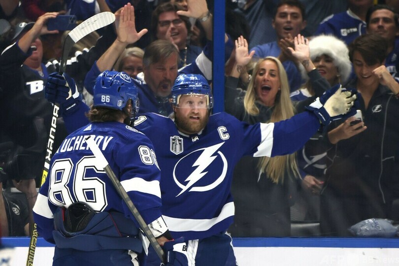 マッキノンの今プレーオフ13点目とレフコネンの同8点目で試合をひっくり返されたライトニングは最終盤、同点弾を狙うべくゴーリーのアンドレイ・バシレフスキー(Andrei Vasilevskiy)を下げて追加のアタッカーを投入したが、あと一歩及ばなかった。(c)AFP
