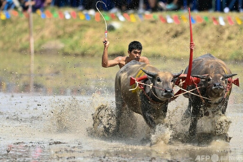 泥しぶき上げて水田をダッシュ! 伝統の水牛レース タイ