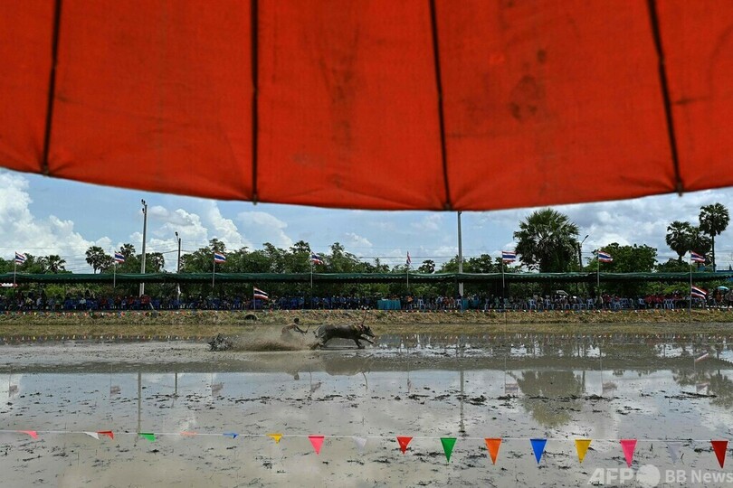 泥しぶき上げて水田をダッシュ! 伝統の水牛レース タイ