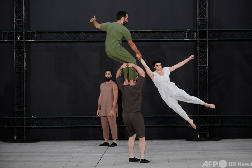 【7月3日 AFP】23年春夏パリ・ファッションウィーク(Paris Fashion Week)のショーで「イッセイミヤケ(ISSEY MIYAKE)」のメンズウエアを着たモデルたち。フランス・パリで。(c)AFP