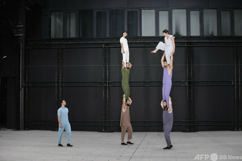 【7月3日 AFP】23年春夏パリ・ファッションウィーク(Paris Fashion Week)のショーで「イッセイミヤケ(ISSEY MIYAKE)」のメンズウエアを着たモデルたち。フランス・パリで。(c)AFP