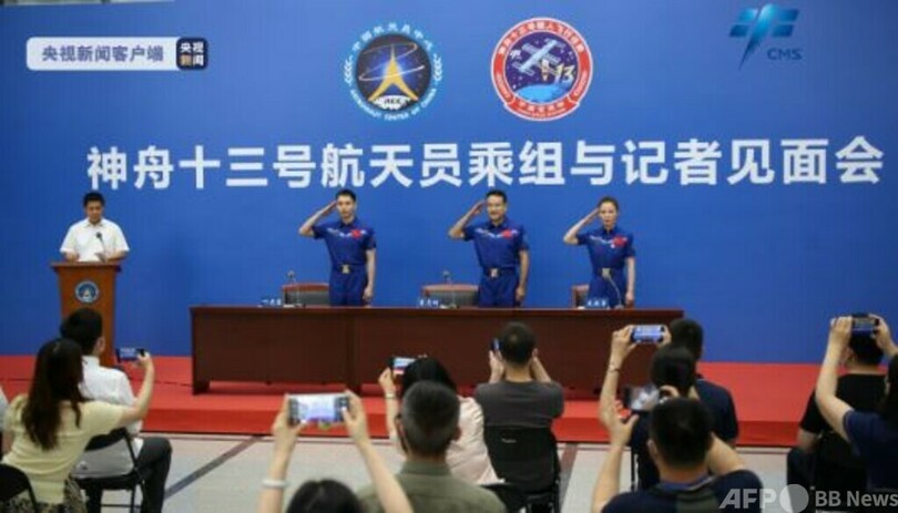 3人は記者会見で、宇宙ステーションの滞在段階や帰還後の関連状況などについて記者の質問に答えました。(c)CGTN Japanese/AFPBB News