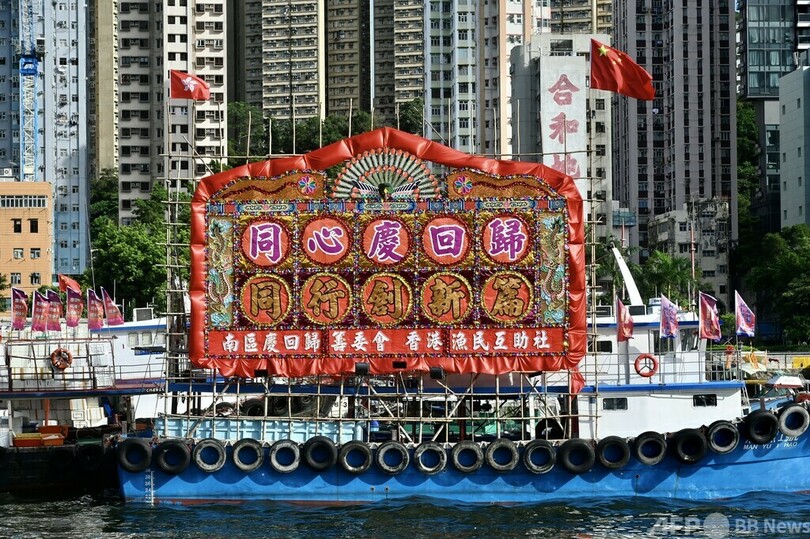 【6月30日 CNS】7月1日で香港返還25周年を迎えるのを記念し、香港の観光地・香港仔避風塘(Aberdeen Typhoon Shelter)で26日、停泊している漁船が一斉に中国の国旗と香港の地区旗を掲げた。「同心慶回帰(心を一つにして復帰を祝う)」と書かれた大型の花看板を設置した漁船もあり、祖国復帰25年の節目を祝った。(c)CNS/JCM/AFPBB News