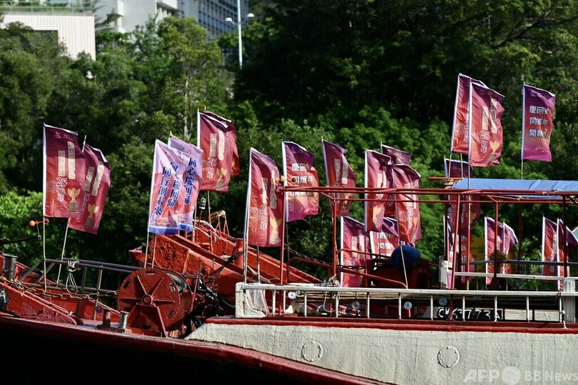 【6月30日 CNS】7月1日で香港返還25周年を迎えるのを記念し、香港の観光地・香港仔避風塘(Aberdeen Typhoon Shelter)で26日、停泊している漁船が一斉に中国の国旗と香港の地区旗を掲げた。「同心慶回帰(心を一つにして復帰を祝う)」と書かれた大型の花看板を設置した漁船もあり、祖国復帰25年の節目を祝った。(c)CNS/JCM/AFPBB News