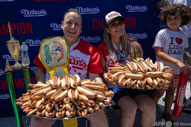 【7月5日 AFP】米ニューヨークのコニーアイランド(Coney Island)で4日、独立記念日恒例のホットドッグ早食い大会が開かれ、ジョーイ・チェスナット(Joey Chestnut)さんが10分間で63個を平らげ、15回目の優勝を果たした。女性部門は須藤美貴(Miki Sudo)さんが返り咲いた。