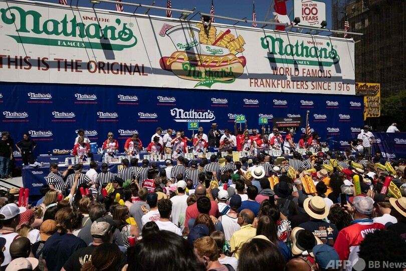 【7月5日 AFP】米ニューヨークのコニーアイランド(Coney Island)で4日、独立記念日恒例のホットドッグ早食い大会が開かれ、ジョーイ・チェスナット(Joey Chestnut)さんが10分間で63個を平らげ、15回目の優勝を果たした。女性部門は須藤美貴(Miki Sudo)さんが返り咲いた。