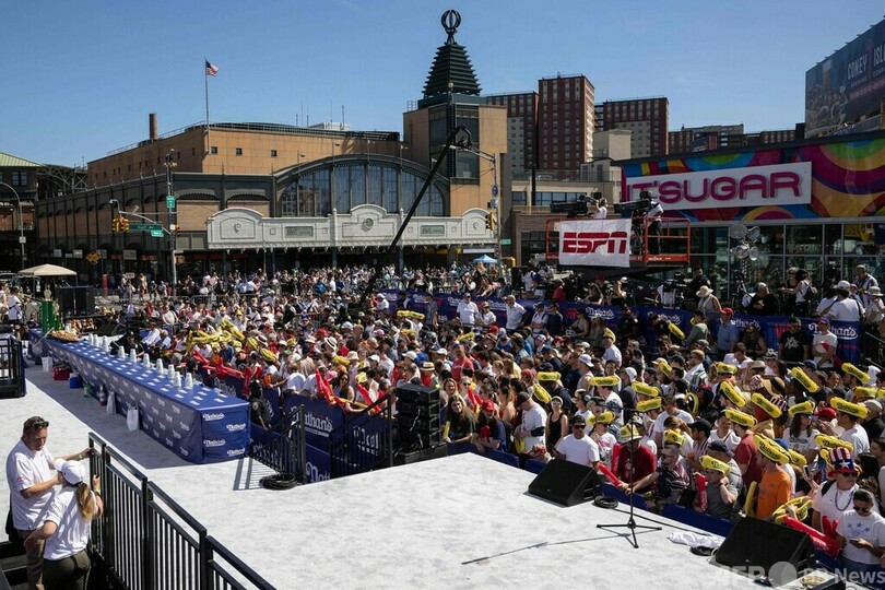 【7月5日 AFP】米ニューヨークのコニーアイランド(Coney Island)で4日、独立記念日恒例のホットドッグ早食い大会が開かれ、ジョーイ・チェスナット(Joey Chestnut)さんが10分間で63個を平らげ、15回目の優勝を果たした。女性部門は須藤美貴(Miki Sudo)さんが返り咲いた。