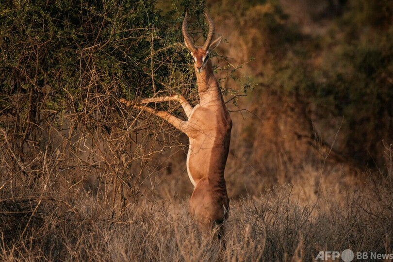 【7月8日 AFP】ケニア・アンボセリ(Amboseli)にある民間の野生動物保護区「セレンケイ・コンサーバンシー(Selenkay Conservancy)」で木の葉を食べる雄のゲレヌク。