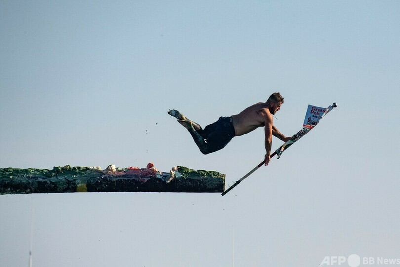 このイベントでは水面から約8メートルの高さに設置された、長さ約12メートルのぬるぬる滑るポールの先端にある旗を取ろうと競い合う。この祭りは100年近く前から行われているが、2019年以降は中止されていた。(c)AFP