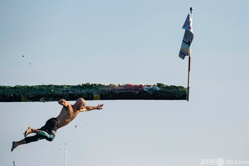 このイベントでは水面から約8メートルの高さに設置された、長さ約12メートルのぬるぬる滑るポールの先端にある旗を取ろうと競い合う。この祭りは100年近く前から行われているが、2019年以降は中止されていた。(c)AFP