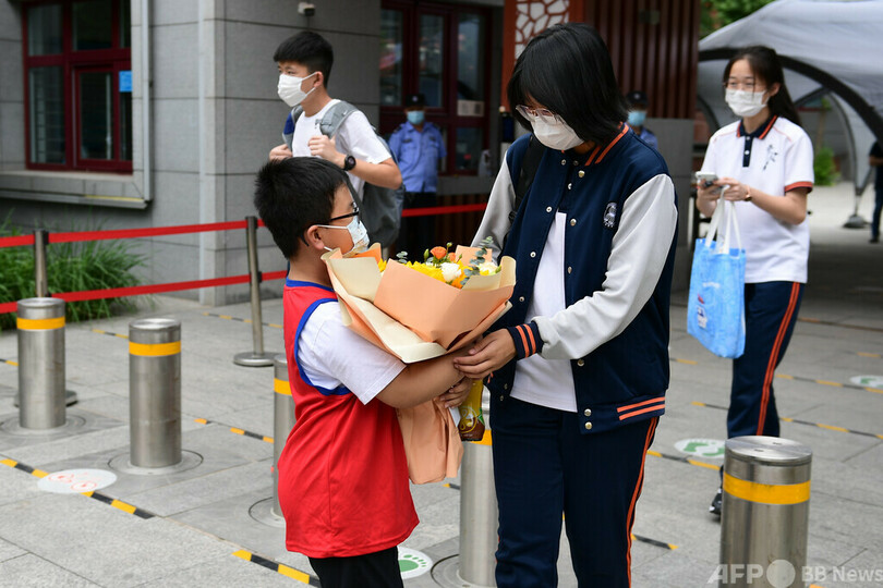 【7月6日 CNS】日本の公立高校入試に相当する北京市の初中学業水平考試(中考)が6月26日、終了した。市内のある入試会場では、多くの受験生が試験を終えて会場から出てくると、保護者やきょうだいがお出迎え。花束を渡したり抱き合ったりして、受験生をねぎらった。(c)CNS/JCM/AFPBB News