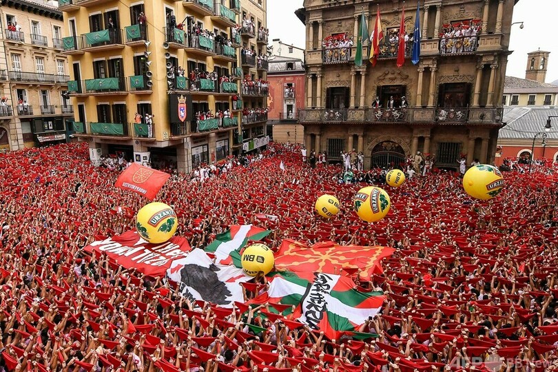 正午(日本時間午後8時)、9日間にわたる祭りの公式開幕を告げるロケット花火「チュピナソ」が市庁舎のバルコニーから打ち上げられると、世界中から集まった数千人の参加者が、「ビバ(万歳)! サン・フェルミン」と叫び、ワインを掛け合った。(c)AFP