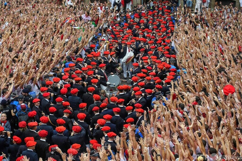 正午(日本時間午後8時)、9日間にわたる祭りの公式開幕を告げるロケット花火「チュピナソ」が市庁舎のバルコニーから打ち上げられると、世界中から集まった数千人の参加者が、「ビバ(万歳)! サン・フェルミン」と叫び、ワインを掛け合った。(c)AFP