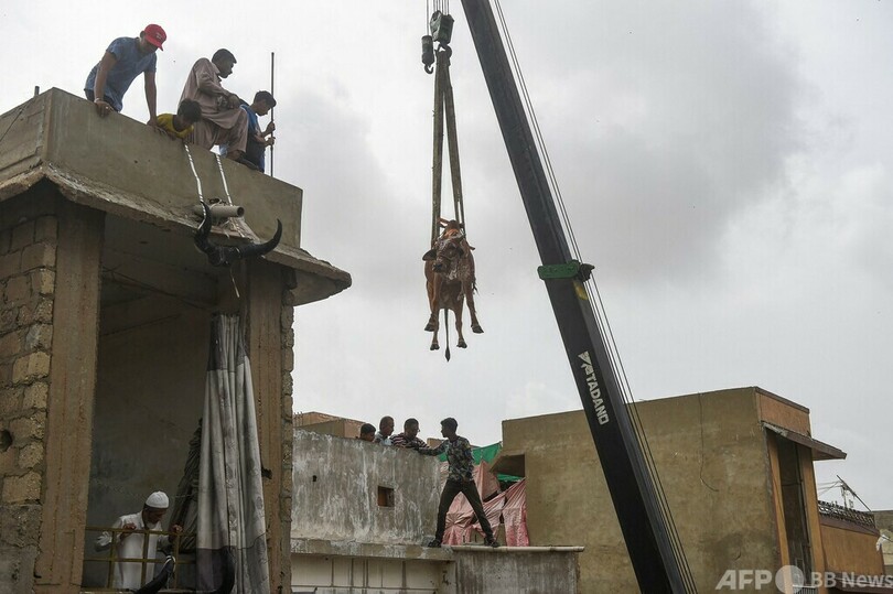 【7月15日 AFP】イスラム教の犠牲祭「イード・アル・アドハ(Eid al-Adha)」の準備で、建物からクレーン車で地面に下ろされる家畜を見る住民ら。パキスタン・カラチ(Karachi)で。(c)AFP