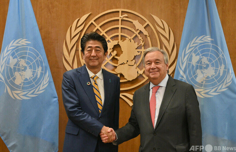 国連のアントニオ・グテレス(Antonio Guterres)事務総長は報道官を通じ発表した声明で、安倍氏の「恐ろしい殺害に悲嘆している」と表明。「安倍氏は、多国間主義の強固な擁護者、尊敬される指導者、そして国連の支援者として記憶されるだろう」と述べた。(c)AFP