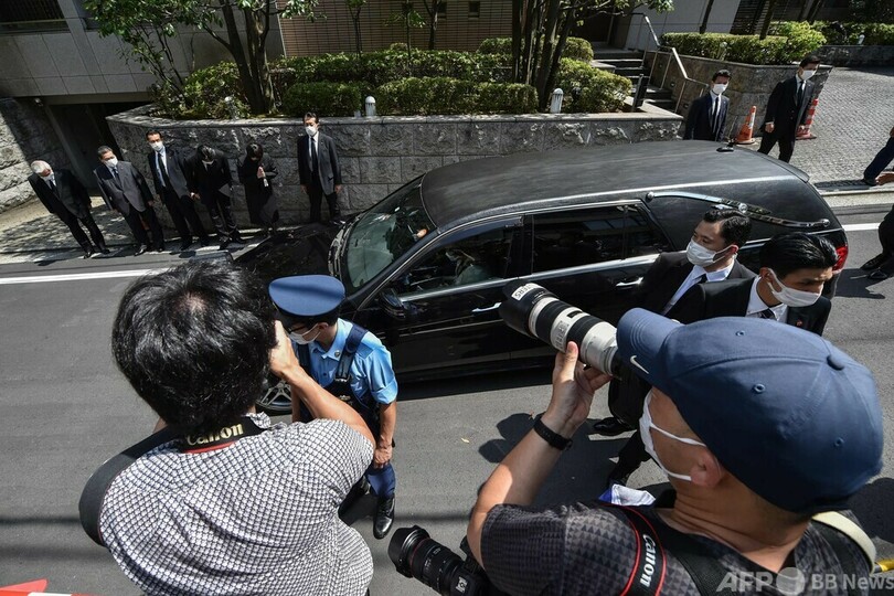 テレビ映像によると、自宅前では喪服を着た自民党幹部が迎えた。(c)AFP